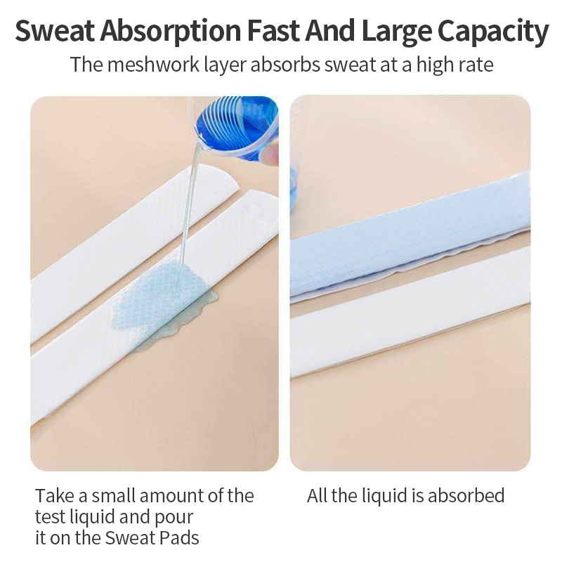 Light weight; Portable & Hygienic; Amazing absorption, sweat pads are made of FDA proved non-woven fabric (top layer) and airlaid paper (back layer), easy to stick and peel off, no pins or straps are needed.