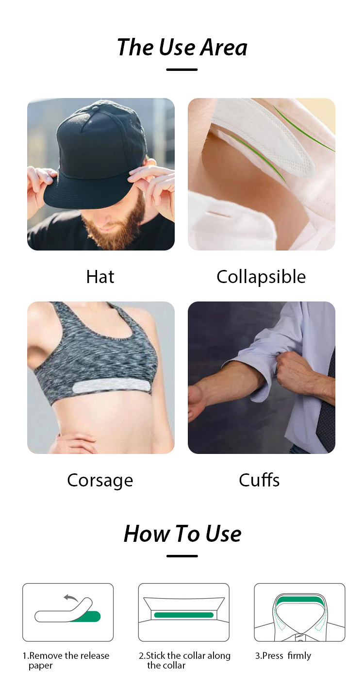 Cut a piece with scissor, then Just peel and apply the liner on the inside of your collar. When the day is over, remove the liner and simply toss it. Your collar and neckline will be dry, plus stain and odor free. Strong self adhesive to the clothes, not to your skin.